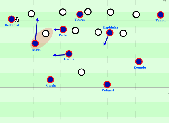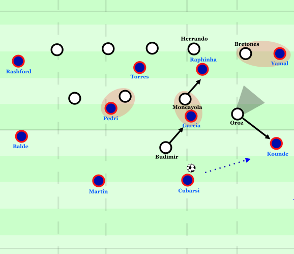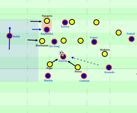 Barcelona konnte also bereits nach wenigen Minuten die Aktivität von Villarreals Sturm überwinden. Da auf García nur von hinten Druck ausgeübt werden konnte, war das vertikale Aufdrehen nach Anspiel des Franzosen und konnte folgend den Diagonalball in die ballferne Breite auf den aufschiebenden Linksverteidiger Balde spielen. Barcelona bereitete diese Muster gezielt vor: Einerseits kippte Flügelspieler Raphinha ein und band dadurch Rechtsverteidiger Navarro, andererseits rückte Rechtsaußen Buchanan heraus, um den ballfernen Zehner De Jong zu markieren. Die Überzahl in der ballfernen Breite versuchte Barcelona über García auszuspielen, was ihm mit präzisen Diagonalbällen auch gelang. Balde hatte an diesem Abend jedoch Probleme bei der Verwertung dieser hohen Bälle, sodass sein unsauberer erster Kontakt den möglichen Dynamikvorteil mehrfach vermieste.