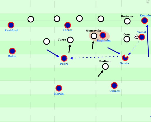 Zwar versuchte Osasuna, diese Mechanismen durch rückwärtiges Pressing von Budimir zu unterbinden, allerdings konnte er die weit ausweichenden ballnahen Bewegungen, vor allem von García, nur unzureichend kontrollieren. Zudem hatte er aufgrund seines Pressingwinkels von hinten und des weiten Ausweichens der Achter kaum Zugriff, sodass García und Pedri wiederholt offen zum Zentrum aufdrehen konnten. Durch das Zurückfallen der Osasuna-Achter zur Isolation der Passwege auf Barcelonas Stürmer konnte sich auch Pedri im Zurückfallen von Torró lösen und war dadurch für García horizontal anspielbar. In der Folge verlagerte Pedri vergleichsweise direkt auf Balde und Rashford. Auch hier lässt sich das Thema Vorsicht anführen: Pedri suchte nur selten das direkte Spiel auf Stürmer Torres zwischen den Linien. Dies dürfte zumindest teilweise personell bedingt sein, da Torres im Saisonverlauf immer wieder Probleme im Wandspiel offenbarte, insbesondere im Vergleich zu seinem Pendant Lewandowski.