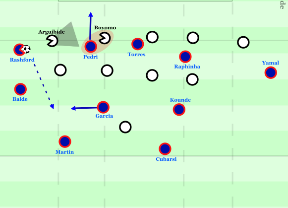 Gegen Flügelverteidiger Arguibide, der nach Verlagerungen zu viel Abstand zum Gegenspieler ließ, konnte Rashford folglich einen gewissen Dynamikvorteil erzeugen und suchte vermehrt das Dribbling entlang der Grundlinie. Bislang fehlte jedoch der entscheidende Anschluss: Balde schob zwar immer wieder hinterlaufend durch, doch Rashford hätte idealerweise eine tiefere Anspielstation im Halbraum benötigt, um Osasuna das Übergeben in der Breite zu erschweren. Diese Optionen boten weder Außenverteidiger Balde noch der zu zentral agierende Stürmer Torres. Rashfords flache Flanken fanden zudem keinen Abnehmer, da Osasuna mit der Fünferkette nach Dribblings weit zurückfiel und etwaige Wege rund um die Fünf-Meter-Linie konsequent schloss. Später zeigte sich Pedri offensiver, demnach schob der linke Achter immer wieder in den linken Halbraum, um Rashford eine entsprechende Tiefenoption zu bieten. Interessanterweise suchte Rashford Pedri jedoch kaum, vermutlich weil durch die horizontale Körperhaltung der Osasuna-Flügelverteidiger (die auch direkte Flanken unterband) der direkte Weg in den Halbraum isoliert wurde und gleichzeitig Halbverteidiger Boyomo Pedris Tiefenläufe eng und frühzeitig aufnahm. Demnach steckte Barcelona in dieser Phase gewissermaßen weiterhin in der Höhe fest.