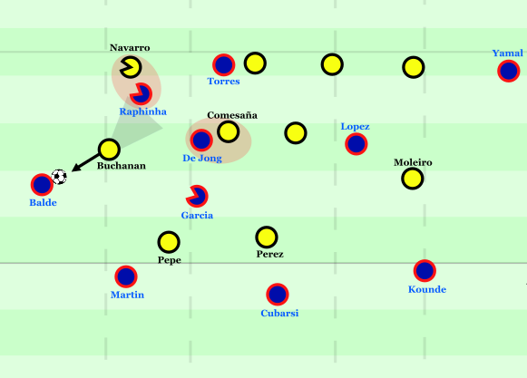 Ähnlich zur rechten Seite sah man auch auf der linken Aufbauseite mit De Jong, Balde und Raphinha wiederholt Versuche, über (anders veranlagte) Dreiecksbildungen zu Kombinationen zu gelangen. Allerdings hatte Linksverteidiger Balde, der höher als sein einkippender Pendant Koundé und insgesamt deutlich breiter agierte, Probleme, sich im Dribbling gegen Rechtsaußen Buchanan durchzusetzen. Raphinha agierte als Flügelspieler meist eingerückt im Halbraum, war dort jedoch durch den diagonalen Anlaufwinkel Buchanans weitgehend isoliert. Zwar schob er immer wieder diagonal in die Breite aus, allerdings isolierte Navarro durch rechtzeitiges Fallenlassen das Tiefenspiel auf den Brasilianer effektiv. De Jong war derweil zentraler positioniert und wurde weitgehend von Achter Comesaña aufgenommen. In der Folge musste Balde immer wieder den Weg zurück über Sechser García suchen, der nun vermehrt vom Doppelsturm Villarreals durch Fouls aus dem Spiel genommen wurde, um mögliche Verlagerungen frühzeitig zu unterbinden.