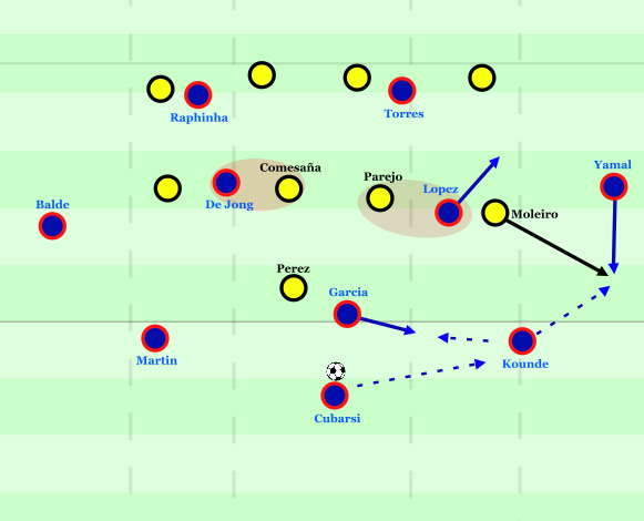 In der Folge entstanden aus dem Dreieck zwischen Koundé, López und Yamal immer wieder saubere Kombinationen. Zum einen hatte Linksverteidiger Cardona deutliche Probleme, aus der Viererkette heraus die sehr breiten und weiten Abkippbewegungen Yamals konsequent aufzunehmen, da dieser durch das Einkippen Koundés insgesamt tiefer in seiner Grundposition gebunden war. Zum anderen verfolgte Achter Parejo die Bewegungen von López im Halbraum nicht direkt, wodurch Villarreal insgesamt nur geringen Zugriff auf der rechten Seite entwickelte. Gerade aufgrund von Yamals herausragendem linken Fuß sowie seiner stabilen Abschirmhaltung gegenüber Gegenspielern aus dem Rücken konnte er immer wieder kontrolliert auf López im Halbraum ablegen, der anschließend mit dem ersten Kontakt ins Dribbling vor die Verteidigungslinie Villarreals gehen konnte. Alterantiv sah man auch einige Dribblings in der Breite von Yamal, welcher jedoch aufgrund der tieferen Grundposition noch nicht den Zug zum Tor entwickeln konnte – bis auf einzelne Flanken aus dem Halbfeld auf Torres blieb die Gefahr aus in der Anfangsphase.
