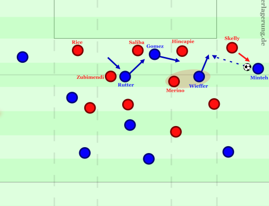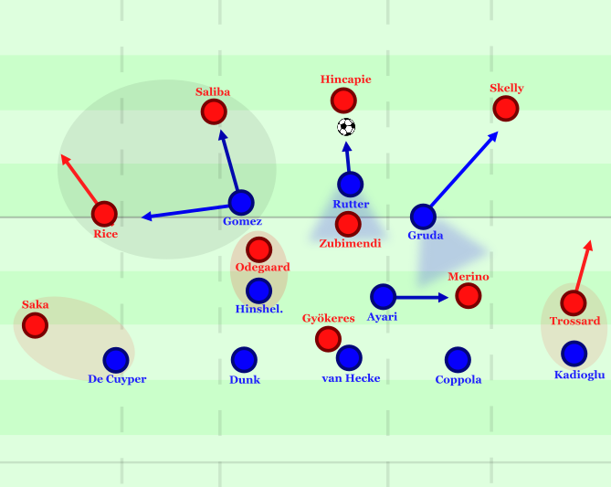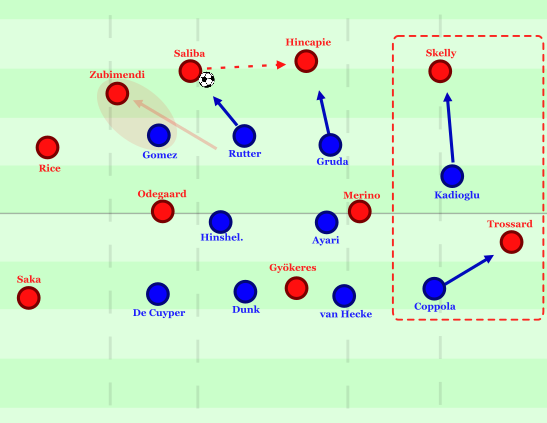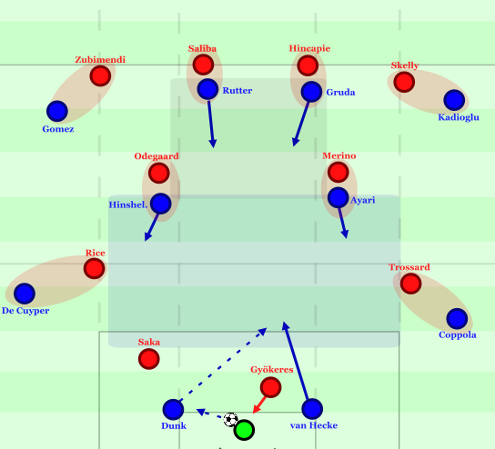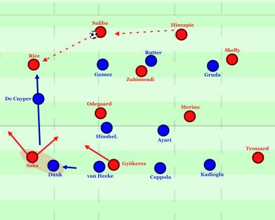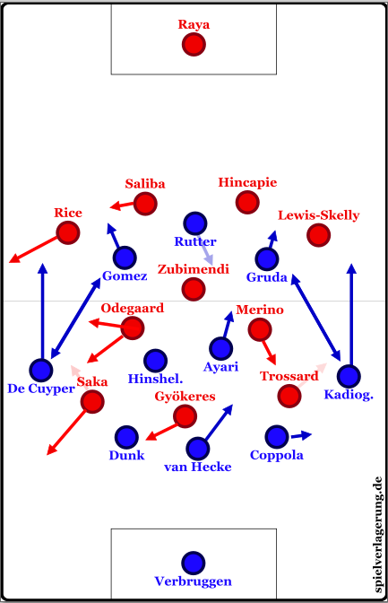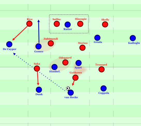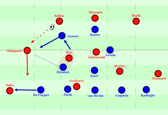 Diese Andribblings des Rechtsverteidigers führten zudem dazu, dass der linke Flügelverteidiger De Cuyper nicht direkt die Breite von Rechtsaußen Saka aufnahm, sondern erst beim Anspiel herausschob. Saka besaß dadurch wiederholt einen Dynamikvorteil gegenüber De Cuyper, konnte mehrfach nach innen ziehen und daraus auch den Abschluss suchen. Früh waren zudem Rotationen zwischen Rechtsverteidiger Rice und Achter Ødegaard zu erkennen. Gerade weil Ødegaard im Dribbling sowie im Aufdrehen nach Anspielen von Saliba noch etwas mehr Tempo aufwies, verschärfte sich das Problem des Überspielens von Gomez bereits in der Anfangsphase. So stand Saka nach vier Minuten nach einem inversen Dribbling gegen den zu passiv herausschiebenden De Cuyper nach einem Anspiel des Norwegers allein vor Keeper Verbruggen. Teilweise schob Achter Hinshelwood zwar in die Breite auf den freien Rechtsverteidiger heraus, musste dafür jedoch seine Mannorientierung im Zentrum auflösen. Dadurch wurde der nun freie Achter im Halbraum immer wieder über den Rechtsverteidiger anspielbar, auch weil Hinshelwood aus der zentralen Position kaum Zugriff in die Breite bekam. Insgesamt ist das Zusammenspiel von Rice und Ødegaard hier klar hervorzuheben – sowohl in den Rotationen als auch im Bespielen von Hinshelwoods Rücken, sobald dieser herausschob – demnach rückte Hinshelwood später auch nicht mehr aus.
