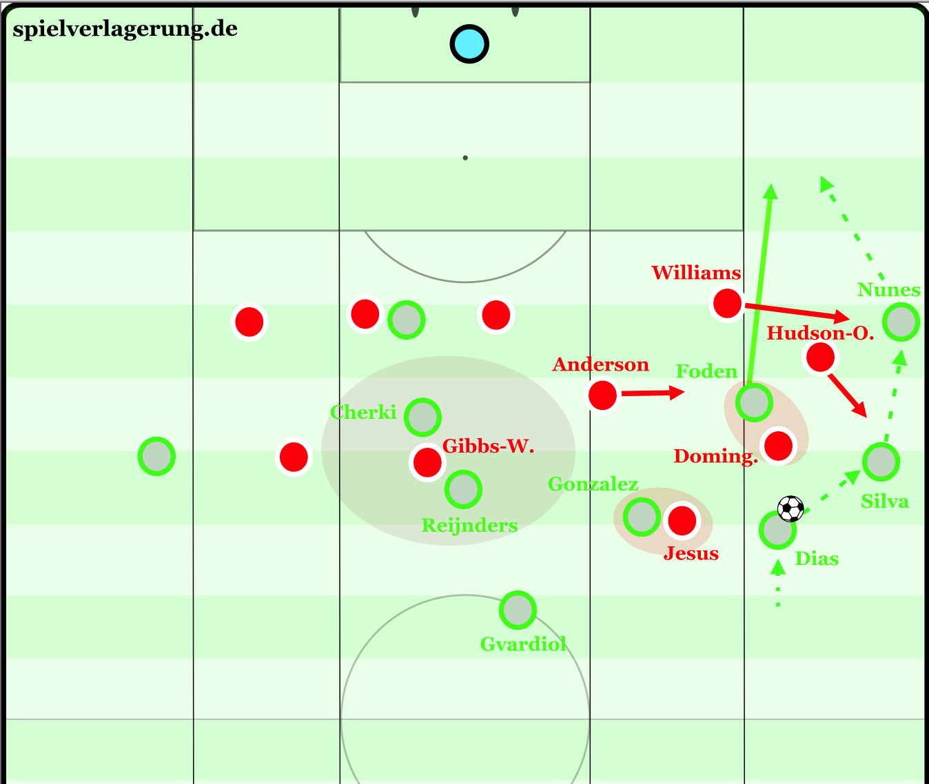 Eine häufig genutzte Möglichkeit war, dass Hudson-Odoi seinen Mannbezug auf Nunes auflöste und auf Silva durchschob. So könnte Dominguez seine Mannorientierung auf Foden im Halbraum enger fassen, wodurch der Pass in die Breite auf Nunes die einzige Option wäre. Durch das Durchschieben von Hudson-Odoi auf Silva wäre allerdings auch ein gut koordiniertes Nachschieben von Williams auf Nunes erforderlich. Ein weiterer Nachteil ist, dass sowohl Silva als auch Nunes durch das improvisierte reaktive Springen einen Bewegungsvorteil haben und sich dadurch in eine offene Position aufdrehen können. Dadurch gelang es Nunes die Tiefe hinter Williams zu bespielen. Denn durch das Rausschieben und den starken Fokus der Innenverteidiger auf Haaland taten sich erhebliche Lücken in der Tiefensicherung für ein Vorderlaufen von Foden auf. Williams schob zudem auch immer wieder zu stürmisch heraus, wodurch Nunes mit dem ersten Kontakt ins Zentrum eindribbeln konnte und einen einfacheren Passweg in die Tiefe bekam. Die Tiefenläufe von Foden wurden allerdings weiterhin eng von Dominguez verfolgt, wodurch dieser zwar die Tiefe erfolgreich attackierte, daraus jedoch keine direkt anschließenden gefährlichen Aktionen entstanden.