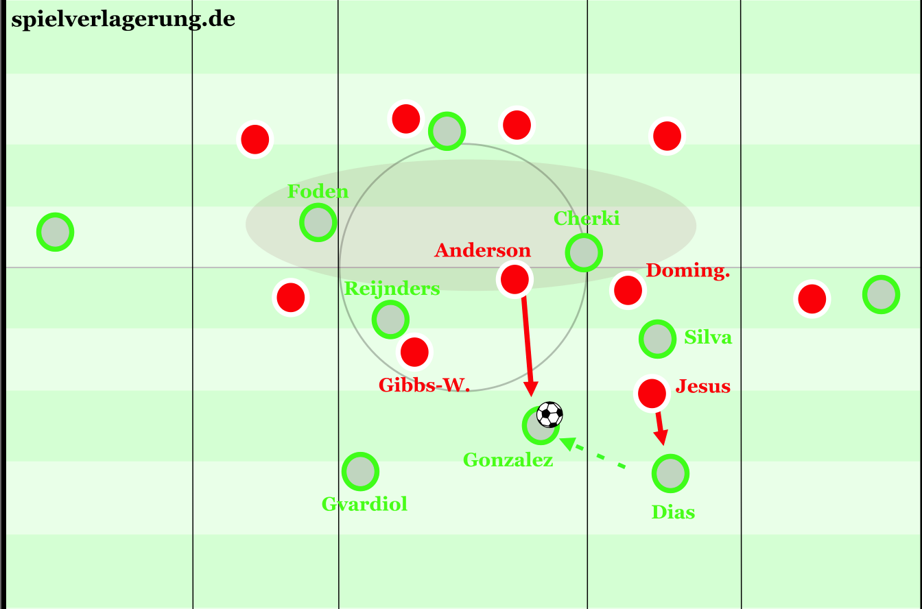 Auch bei Ballbesitz der Kette Citys agierte Jesus etwas weiter nach links gerichtet und lockerte den Mannbezug zu Gonzalez. Aus dieser Position heraus lief Jesus nun Dias sporadisch an und unterband damit das Konstante Andribbeln und damit den Druck auf der linken Defensivseite. Um zu vermeiden, dass Gonzalez sich einfach im Sechserraum aufdrehen konnte agierte Sechser Anderson mehrfach auf dem Sprung und versuchte Gonzalez noch mit dem Rücken zum gegnerischen Tor zu attackieren. Das Timing des Sprungs war hier entscheidend, da Anderson seine den Zwischenlinienraum sichernde Position aufgab. Dadurch entstand das Potential über eine gute Vororientierung von Gonzalez Foden/Cherki im Zwischenlinienraum linienbrechend zu bedienen. Gonzalez hatte jedoch zunehmend Probleme mit dem Druck in seinem Rücken, wodurch diese Potentiale weitgehend ungenutzt blieben.