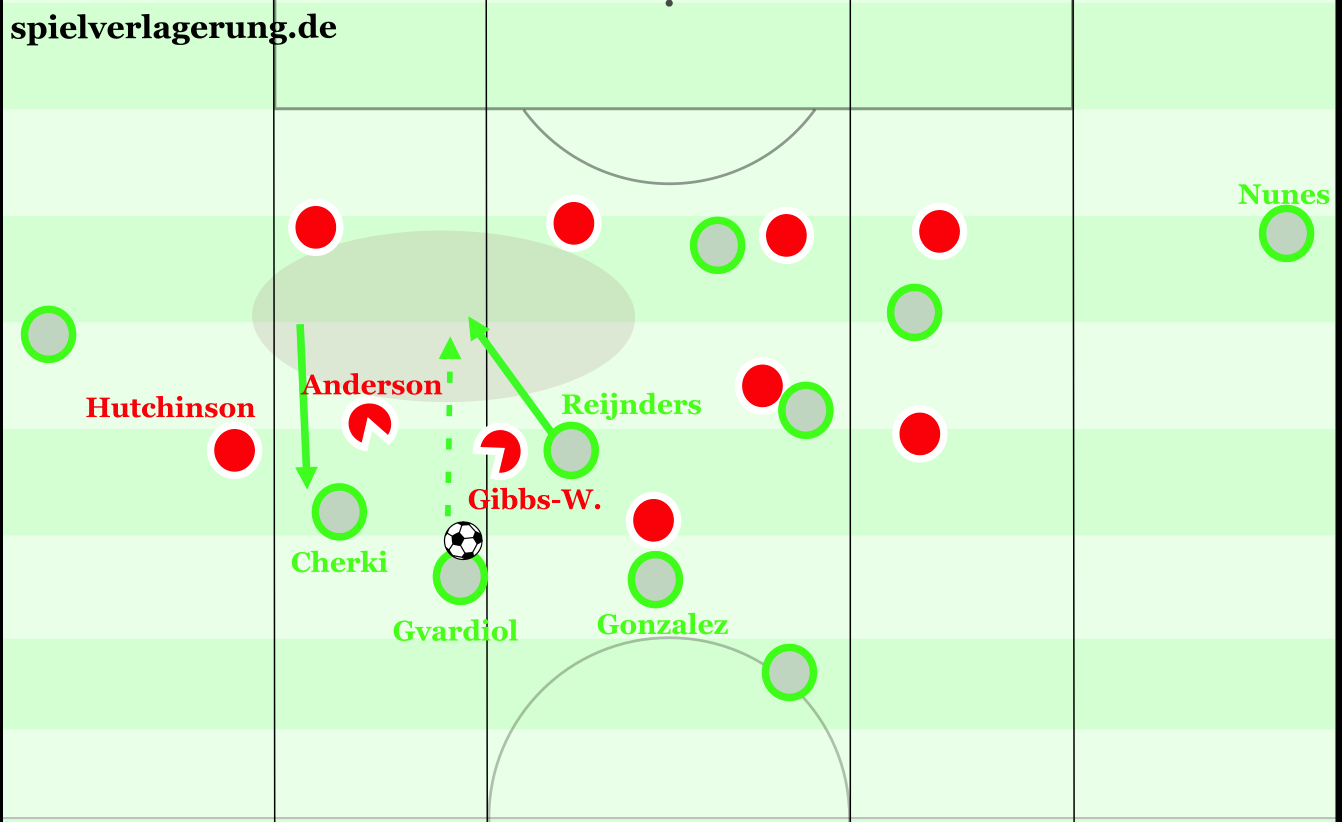 Der zunächst offengelassene linke Halbraum, musste nun dynamisch neu besetzt werden. Dies geschah über Cherki. Dieser gab seine initiale Positionierung im rechten Halbraum auf. Er erkannte den offenen Raum und belief diesen im Rücken der Zentrumsspieler Nottinghams. Dadurch, dass Reijnders Dominguez and der Strafraumkante band, wurde Cherkis Lauf nicht verfolgt. Höchstens Anderson hätte als Sechser den Lauf aufnehmen können. Diesem fehlte es allerdings an der Wahrnehmung für Cherki und war zu sehr darauf fokussiert auf Gonzalez herauszuspringen, um bei einem kurzen Anspiel einen Ballgewinn zu erzielen. Bei ausreichendem Sanning ist allerdings zu vermuten, dass Anderson sich wohl eher für die raumsichernde Option vor der Kette entschieden hätte.