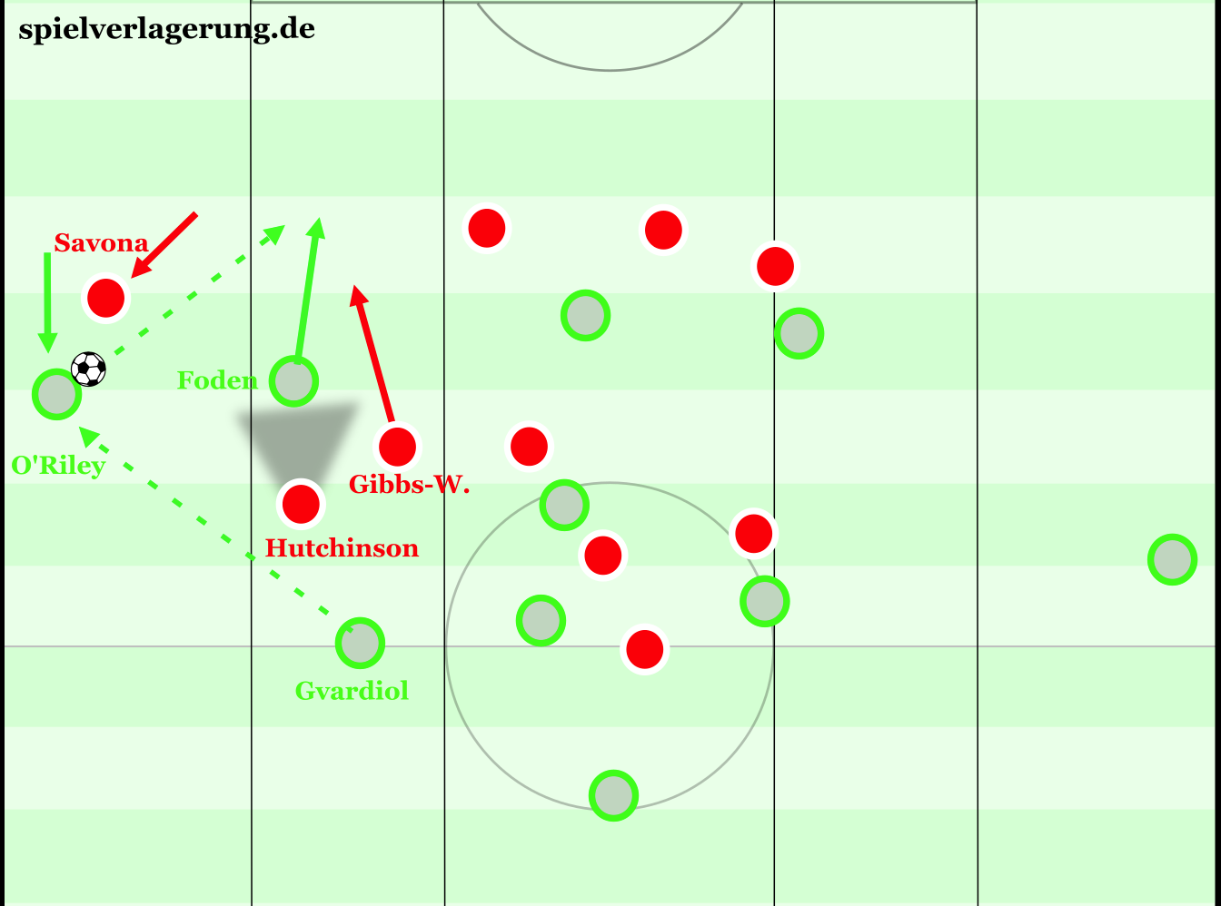 In diesen Raum startete Foden aus dem Halbraum rein und konnte so einen Diagonalpass vor die Kette empfangen. Entscheidend für diese Hereingabe war die Höhenpositionierung von O’Riley. Dieser suchte stets die Höhe des Zwischenlinienraums, um sich dem Rückwärtspressing von Hutchinson zu entziehen und von außen scharf hinter die Mittelfeldkette zu kommen. Ebenso wurde der Pressingweg für Savona so maximal verlängert, was O’Riley mehr Zeit am Ball gab.