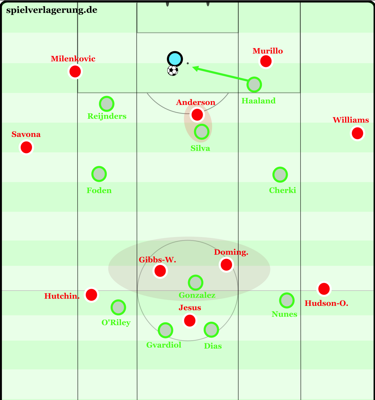 Eine Schlüsselrolle in diesen Momenten nahm Reijnders ein. Dieser bewegte sich klug auf der blinden Seite von Gibbs-White. Dieser musste so während des Verschiebens Reijnders im Blick behalten. Reijnders band mit Gibbs-White und Anderson gleich zwei Gegenspieler auf engem Raum. Sicherlich war in dieser Szene auch fehlende Kommunikation zwischen Gibbs-White und Anderson ein nicht unerheblicher Faktor. Beide lauerten gleichzeitig auf den Sprung auf Sechser Gonzalez, um einen Höhenverlust zu vermeiden. Ein Fallen der Höhe, sowie eine klare Kommunikation an Gibbs-White, sodass dieser sich im Raum an Foden orientiert wäre hier durchaus sinnvoll gewesen. So gelang es Foden sich im Zwischenlinienraum aufzudrehen und auf die Kette zu dribbeln. Auch wenn der Steckpass auf Haaland misslang, gelang es City so für gefährliche Momente zu sorgen.