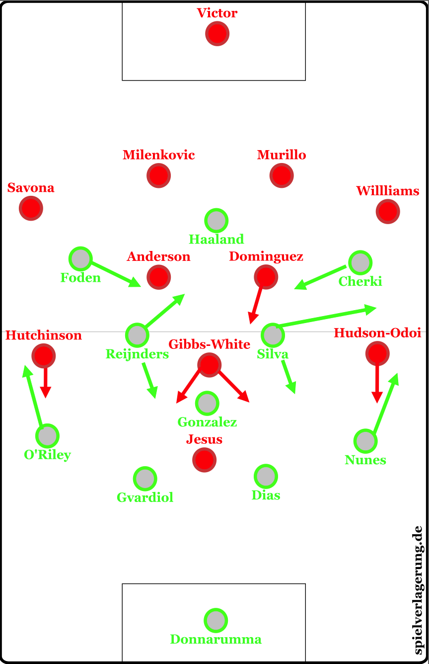Ziel war es eine +1 Überzahl der Innenverteidiger gegen Stürmer Jesus bei langen Bällen zu erzeugen. Dafür agierte Gonzalez temporär im 1gg2 gegen Gibbs-White und Dominguez. Diese Unterzahl sollte durch Einrücken des ballfernen Außenstürmers auf den ballfernen Achter Nottinghams nach Anspiel kompensiert werden. Bei einem direkten langen Ball des Torhüters wurde dieser Mechanismus allerdings ausgehebelt, wodurch Nottingham mit klaren Vorteilen bei zweiten Bällen agierte. Nottingham bespielte diese sich andeutende Schwäche Citys jedoch zu selten. Gerade da Jesus Stärken in der Luft mitbringt und sich durchaus gegen Gvardiol und Dias zu behaupten wusste wäre in diesen Situationen deutlich mehr drin gewesen.
