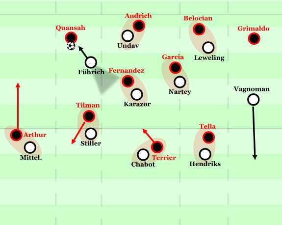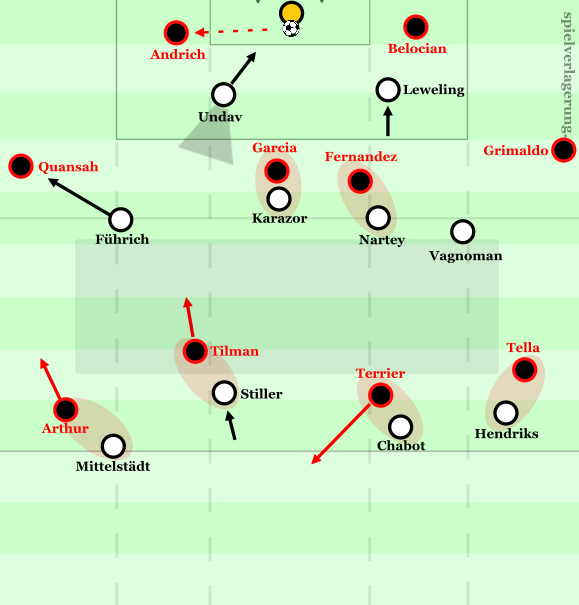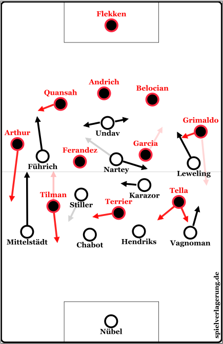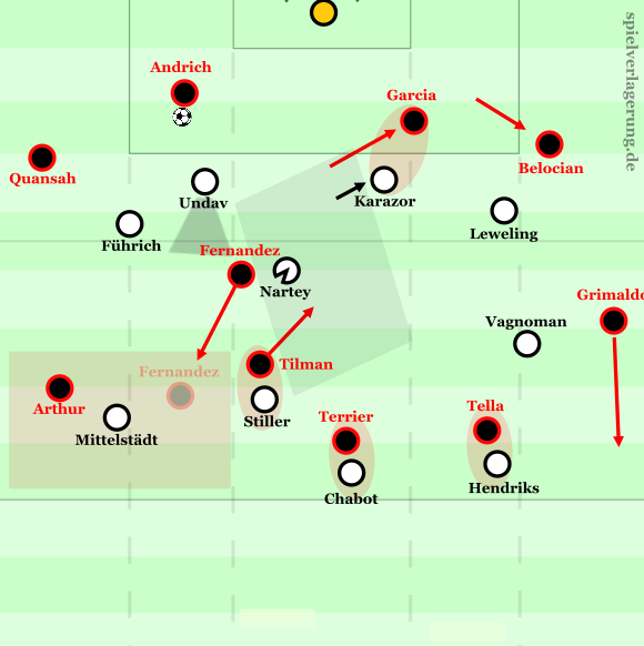 Teilweise gelang es Leverkusen dennoch (etwa nach Freistößen in der eigenen Hälfte), über Belocian-Grimaldo aufzubauen. Gerade wenn sich dieser mit der Zeit tiefer positionierte und Vagnoman beim Aufnehmen der Abkipbewegungen des Spaniers Probleme hatte, zeigte sich ein positiver Effekt auf das Aufbauspiel. Grimaldo lieferte im ersten Kontakt deutlich mehr Qualität als sein Pendant und leitete direkt auf Tella weiter, der zwar einen Tempovorteil gegenüber Hendriks in den Ausweichbewegungen hatte, aber physisch gegen den starken Holländer deutliche Probleme bekam. Insgesamt fehlte zudem die Unterstützung der Achter, die im höheren Aufbauspiel gegen Nartey/Karazor Probleme hatten und sich zu stark auf die rechte Aufbauseite treiben ließen. Auch die Leverkusener Zentrumsakteure wurden kaum angespielt und konnten folglich kaum Dribblings im Zentrum suchen, was eine der zentralen Stärken Leverkusens reduzierte – wie sich in dieser Saison mehrfach zeigte.