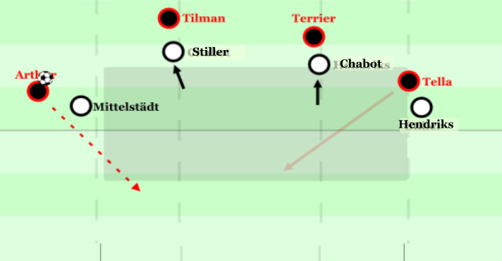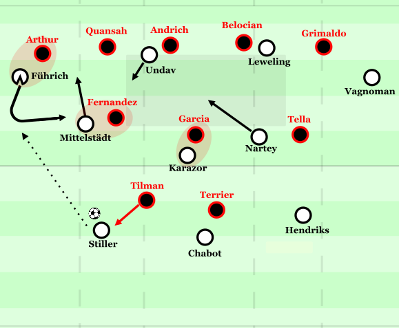 Leverkusen reagierte daher mit einigen Rotationen in der Angriffsreihe, besonders Tella rotierte mit Terrier. Seinem Gegenspieler Chabot wurden damit zwar durch seine extreme Agilität ein paar Probleme bereitet, und konnte sich mehrmals abkippend lösen, hatte aber am Ende gerade beim Abschirmen weiter Schwierigkeiten und konnte kaum aufdrehen für Dribblings. Folglich fehlten aber auch die direkten Tiefenoptionen: Terrier bot kaum solche an, Tillman agierte häufig zu tief. Tendenziell war der Drang von Tillman, sich vom Gegenspieler zu lösen, so groß, dass er zunehmend auf einer Höhe mit den eigenen Mittelfeldspielern agierte. Dort konnte er zwar vereinzelt von den Verteidigern angespielt werden, oft blieb aber nur ein Abklatschen möglich, da Stiller den Wegen im Rücken eng folgte. Vielmehr verlor man so zusätzliche Präsenz in der Angriffsreihe und im Greifen der zweiten Bälle.