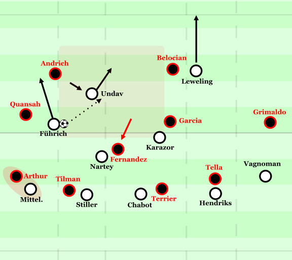 Dieses diagonale Anlaufen führte allerdings dazu, dass Flekken den anlaufenden Stürmer durchaus überspielen bzw. den linken Innenverteidiger Andrich anspielen konnte. Dessen Vertikalpassweg in den Halbraum war zwar anschließend durch die engen Achter offen, jedoch stand Leverkusen vor einem alten Problem: Tillman kippte beim Ballspiel Flekkens ab und war dann beim Andribbeln Andrichs zu tief auf Höhe des gegnerischen Linksaußen Führich positioniert, sodass er nicht in die Breite hätte ablegen können. Gerade durch diese Nähe zu Führich im Halbraum hätte man sich zudem in eine 1-gegen-2-Unterzahl gegen Führich und den herausverteidigenden Stiller befördert. Entsprechend wurde Tillman nicht von Andrich angespielt, der insgesamt auch im Andribbeln zu wenig Tempo zeigte, sodass der eigentlich überspielte Stürmer Undav ihn mehrmals von hinten stark unter Druck setzen konnte und er folglich meist den langen Ball wählen musste.