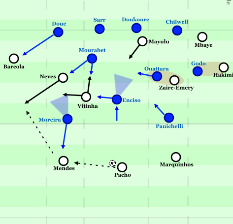 Mit zunehmender Spielzeit hatte man zwar den Eindruck, dass sich Vitinha bewusst enger um Mourabet herum positionierte, um dessen Ausschieben beim Ballspiel von Neves in die Breite zu unterbinden. Allerdings übernahm Enciso beim Pass von Pacho auf die Halbverteidiger konsequent den Sechser, sodass Mourabet wiederum auf Neves in die Breite ausschieben konnte und dessen Bindungsversuche ins Leere liefen. Zwar führte dieser Übergabeprozess von Vitinha über Mourabet zu Enciso situativ dazu, dass Mourabet etwas zu spät diagonal in die Breite. Nominell ergab sich dort kurzfristig ein 2-gegen-1 mit Neves und Barcola gegen Linksverteidiger Doué, dieser ging jedoch sofort in die enge Markierung auf Barcola. kam.