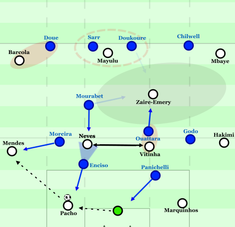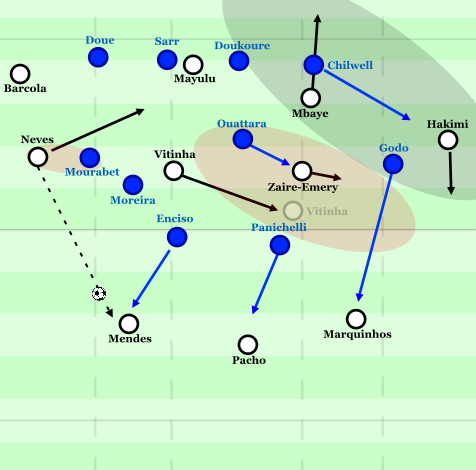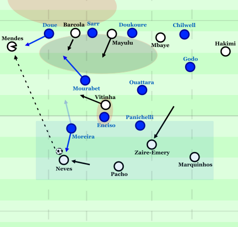 Durch Godos breite Grundposition wurden auch die Passwege des Halbverteidigers vertikal im Halbraum nicht isoliert, wodurch die Unterzahlsituation dort besonders präsent wurde. Godos Aufrücken in der ersten Pressinglinie hatte außerdem zur Folge, dass der initiale Gegenspieler Hakimi in der Breite übernommen werden musste. Linksverteidiger Chilwell erkannte zwar die Problematik des Ausschiebens bei der Übernahme von Hakimi, da er dadurch den direkten Tiefenweg für Mbaye geöffnet hätte und insgesamt eine hohe Anfälligkeit für lange Bälle bestand – doch geleitet von Hakimis Abkippbewegungen schob er beim Anspiel auf Zaïre-Emery im Halbraum meist auf Hakimi aus. Diese Zwischenlösung Chilwells hatte jedoch zur Folge, dass IV Doukouré etwas unvorbereitet agierte und zusätzlich durch seinen Tempo- und Agilitätsnachteil gegen Mbaye diesen im Tiefenlauf teils verlor. Zaire-Emery konnte ihn daraufhin mehrfach nach aufdrehen direkt in die Tiefe beziehungsweise ins Dribbling einsetzen und ins letzte Drittel bringen, weil Outtara zu lose im direkten Duell agierte, – wie etwa in der 5. Spielminute Neves vor der Box anspielen, der ähnlich wie zuvor Zaire-Emery diagonal einrückte und dadurch den Raum vor der Box besetzte.