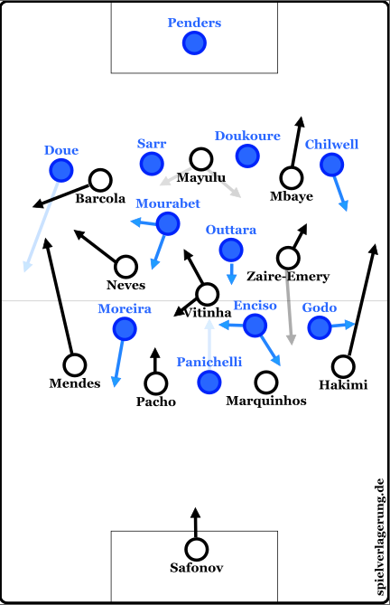 Zwar ließ sich Linksaußen Godo, wie bereits beschrieben, auf der linken Seite mit Hakimi mannorientiert fallen und konnte dadurch vor allem direkte Verlagerungen auf die linke Seite unterbinden. Dennoch hatte er beim Ballspiel des Marokkaners ähnliche Probleme im Anlaufwinkel wie RV Doue, da er ballnah immer wieder neben Chilwell in eine temporäre Fünferkette als Flügelverteidiger einkippte, statt auf gleicher Höhe mit Hakimi zu bleiben. Durch diesen diagonalen Anlaufwinkel konnte das Horizontalspiel nicht isoliert werden – zudem hatte Godo Schwierigkeiten im Bewegungskomplex, um den Tiefenlauf Hakimis nach der Ablage von Mbaye aufzunehmen. Die Flanken Hakimis führten bislang jedoch zu nichts, auch weil Mayulu durch seine Präsenz zwischen den Linien zunehmend in der Box fehlte und der ballferne Flügelspieler Barcola zu selten in die Box nachschob.