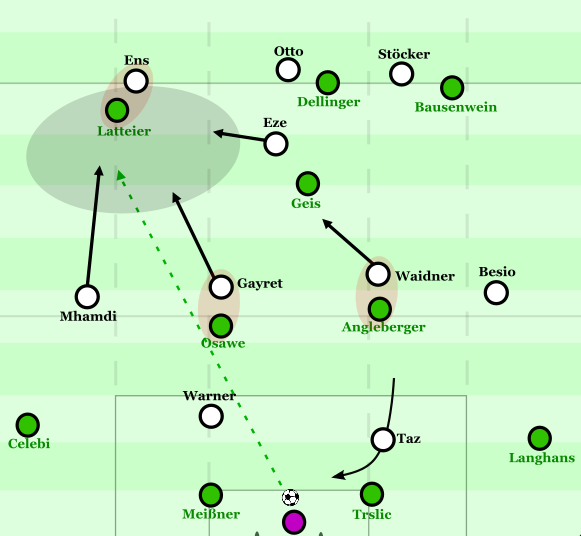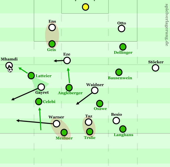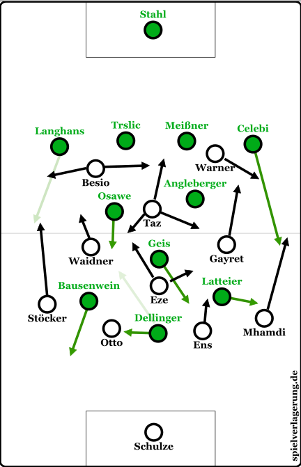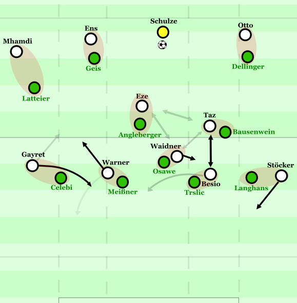 Insgesamt dient aber Besio als Zielspieler im Sturm der Verler. Zwar rotiert er auch immer wieder mit Taz oder Warner, doch allgemein geht es beim SC sehr viel darum, für den Schweizer Räume für lange Bälle in die Tiefe im Zentrum zu schaffen. So kippte Warner etwa immer wieder diagonal in den linken Halbraum ab, um LIV Meißner aus dem Zentrum zu ziehen und Raum für Besios bogenläufiges Durchschieben zu schaffen, oder – bei Besios Rotation gen rechten Halbraum – immer wieder Gayret ab, um LV Celebi aus der Linie zu ziehen und Tiefenwege für Besio zu öffnen. Die Rotation mit Taz dient vor allem dazu, dass er Trslic herauszieht, im Bogen durchschiebt und dann seinen Antrittsvorteil gegen den Verteidiger nutzt.
