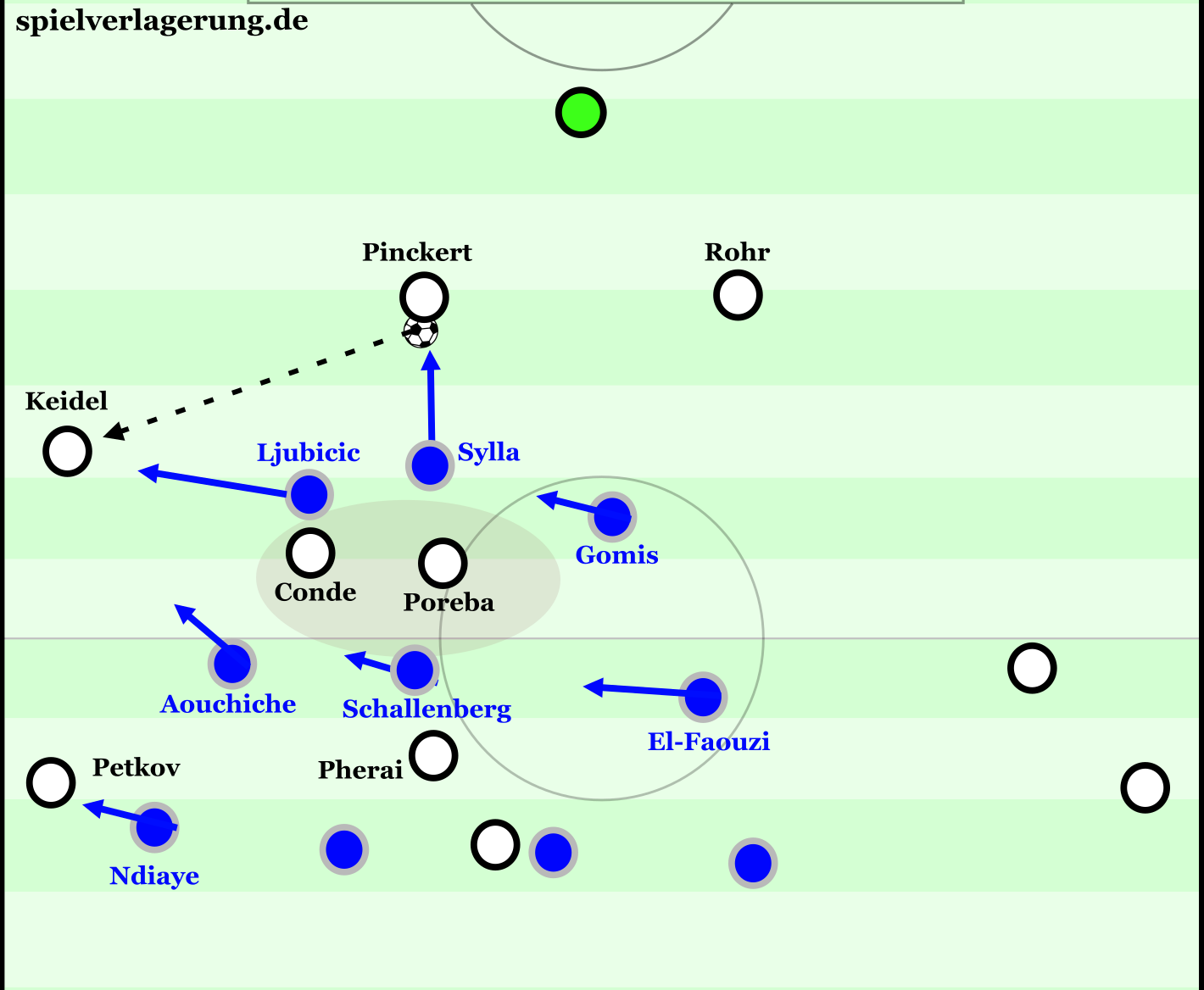 Linksverteidiger Ndiaye schob in diesen Momenten etwas höher, wodurch Aouchiche als Verbindungsspieler in die Breite agierte. Dies sorgte dafür, dass Petkov durchschob, um auf das aktive Andribbeln von Aouchiche zu reagieren. Elversberg zeigte sich in diesen Momenten etwas zu passiv im Durchschieben. Gerade durch das Überladen durch El-Faouzi tat man sich schwer für klare Zuordnungen zu sorgen. So war Conde nach dem Abkippen von Aouchiche zu stark an Ljubicic orientiert und verpasste es El-Faouzi aufzunehmen. Dadurch geriet Keidel temporär in eine 1gg2 Unterzahl und wurde auf halbem Wege beim Rausschieben erwischt.