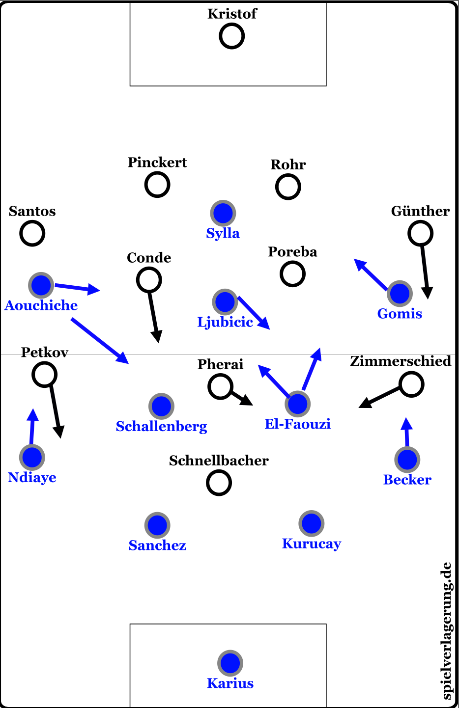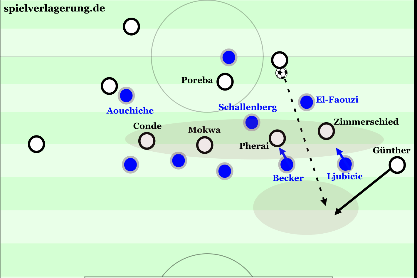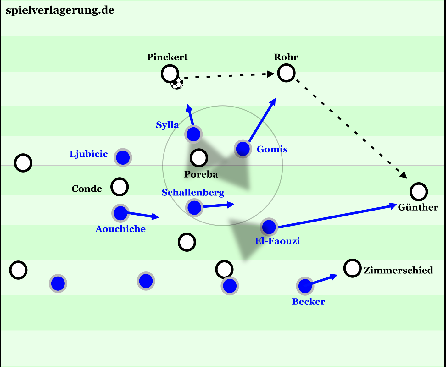 Schallenberg agierte mehr im Raum zwischen Conde und Pherai und war so in der Lage die möglichen Diagonalbälle in die letzte Linie abzufangen, während El-Faouzi ballfern auf Pherai durchschob. Entscheidend war, dass Schallenberg und Aouchiche beide im Zugriffsbereich von Conde agierten, wodurch dieser erhebliche Probleme hatte ins Spiel zu finden.