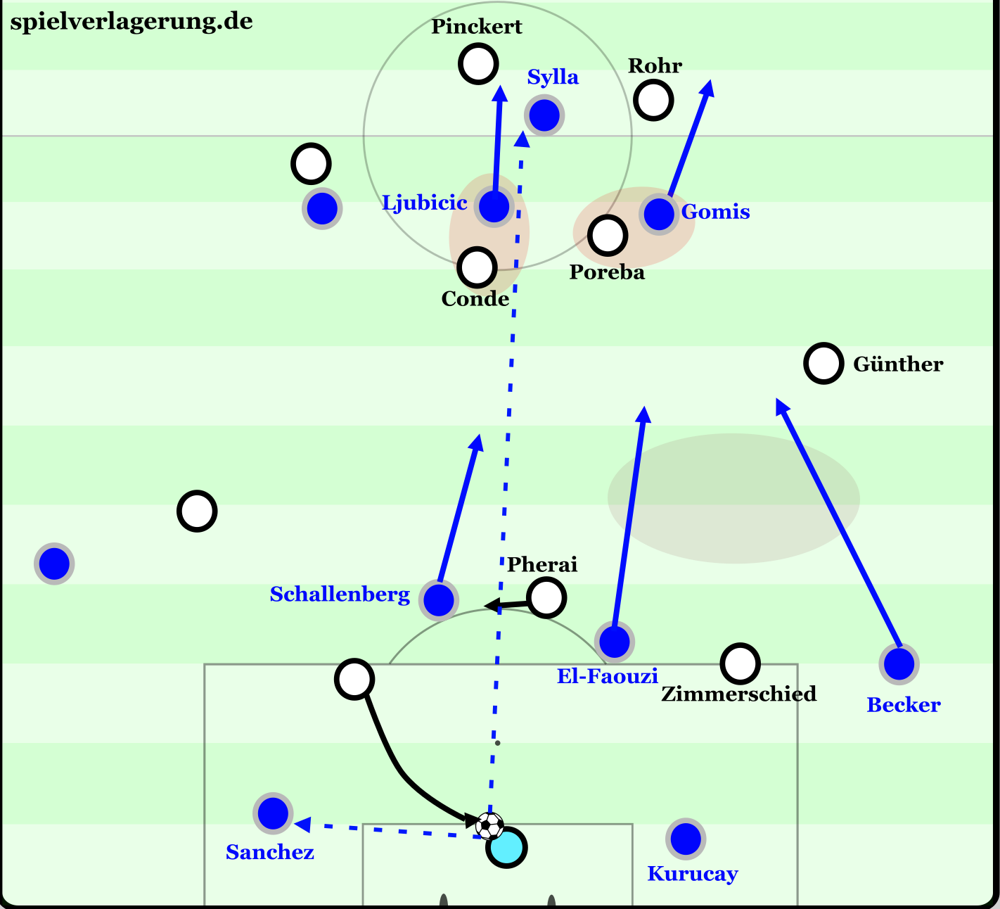 Diese gute Gegnerbindung über das Zentrum durch die Achter/Zehner war generell eines der Schalker Merkmale in diesem Spiel. Über die numerische Zentrumsüberlegenheit gelang es mehrfach über Ablagen einen freien Fuß für Nidaye zu bekommen. Durch Tiefenläufe gerade von El-Faouzi und Ljubicic gelang es wie vor dem Tor zum 1:1 Conde tief zu binden, sodass Ndiaye in die Dynamik des Nachrückens von Aouchiche in den Block spielen konnte.