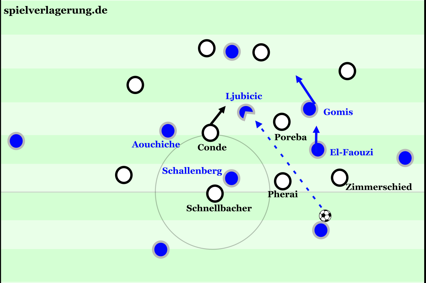 Dieser positionierte sich immer wieder klug zwischen den beiden Sechsern. Conde positionierte sich zunächst halb-halb zwischen Halbraumspieler Aouchiche, während sich Poreba etwas mehr in den Halbraum zwischen El-Faouzi und Gomis orientierte. Die Außenstürmer befanden sich aufgrund ihrer hohen und breiten Positionierung außerhalb des erweiterten Zugriffsbereichs. Die Sechser mussten sich deshalb in diesen Unterzahlsituationen zentral Richtung Ball orientieren, wodurch es schwer wurde die Bewegungen im Halbraum in ihren Rücken hinein zu kontrollieren. Conde, der den direkten Druck auf Ljubicic suchte, machte dabei noch einen sehr ordentlichen Job.